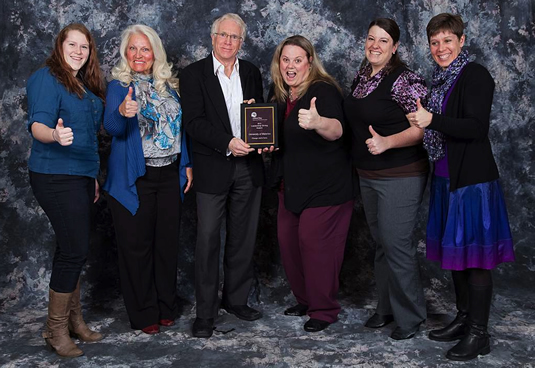 Accepting on behalf of the team were (l-r): Elle Crevits – 2012 United Way co-op student, Bonnie Oberle – leadership giving, Richard Wells – United Way co-chair, Alexandra Lippert – United Way co-chair, Melissa McNown Smith – volunteer management, Alison Boyd – incoming office manager. Also at the ceremony but not pictured was Tim Jackson – leadership giving chair.