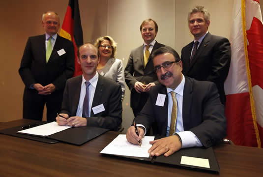 President Feridun Hamdullahpur signs a Memorandum of Understanding with Vice Rector Dr. Nils Metzler-Nolte of Ruhr University Bochum in Berlin on Thursday, March 8 as part of the U15 universities' visit to Germany. Standing behind them are (l-r) Canadian ambassador to Germany Peter Boehm, North Rhine-Westphalia's Minister for Innovation, Science and Research Svenja Schulze, Parliamentary State Secretary Thomas Rachel, and Parliamentary Secretary Mike Lake. Hamdullahpur returns to Canada on Wednesday.
