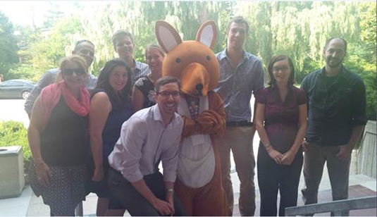 AHSSIE, the official mascot of the Faculty of Applied Health Sciences, is pictured above with members of the university's Marketing & Undergraduate Recruitment department while on a mail run (or hop, if you prefer), with letters stashed in his handy pouch.