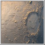 "Happy Face Crater", 215 km across, as seen by the Mars Orbiter in 1999 |